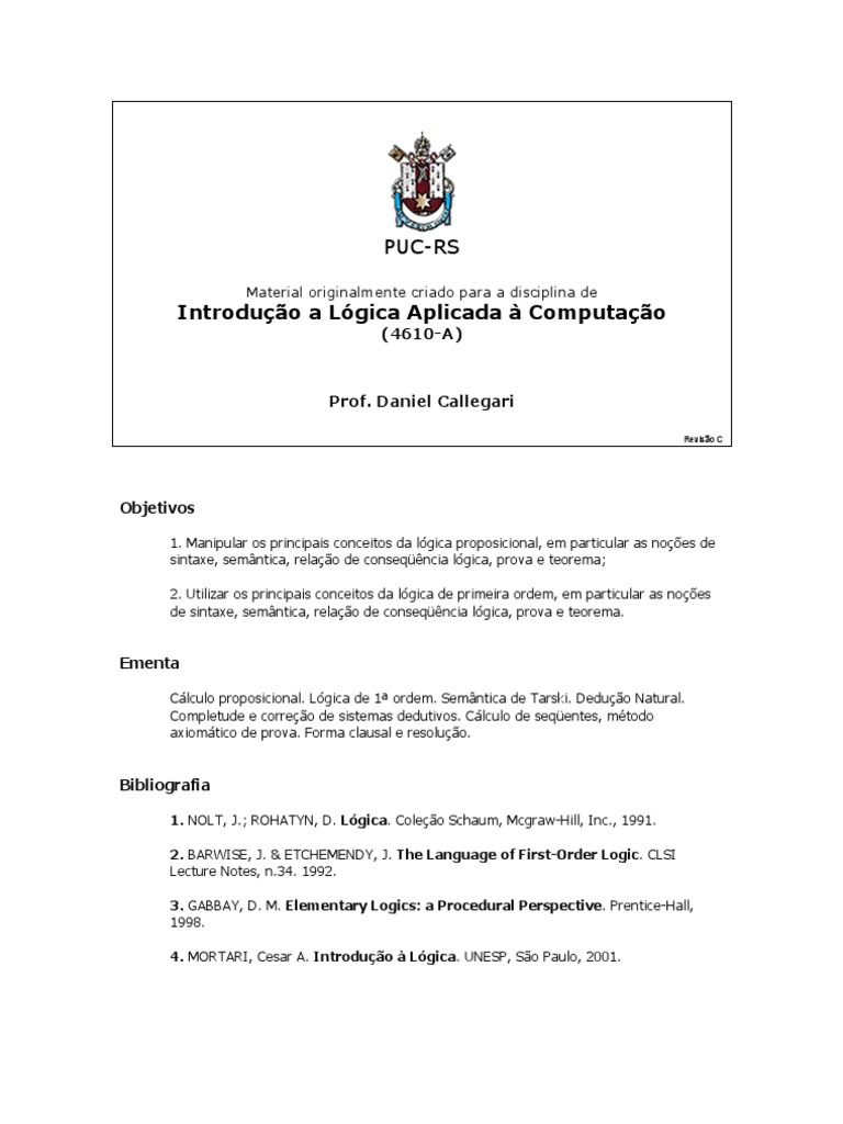 Clculo proposicional. Lgica de 1 ordem. Semntica de Tarski. Deduo Natural. Completude e correo de sistemas dedutivos. Clculo de seqentes, mtodo axiomtico de prova. Forma clausal e resoluo.
