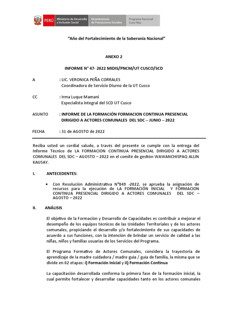 INFORME N° 47- 2022 MIDIS/PNCM/UT CUSCO/SCD