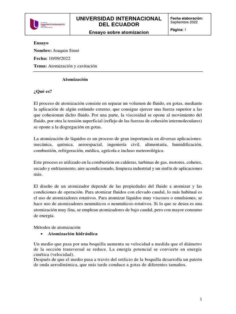 El proceso de atomización consiste en separar un volumen de fluido, en gotas, mediante