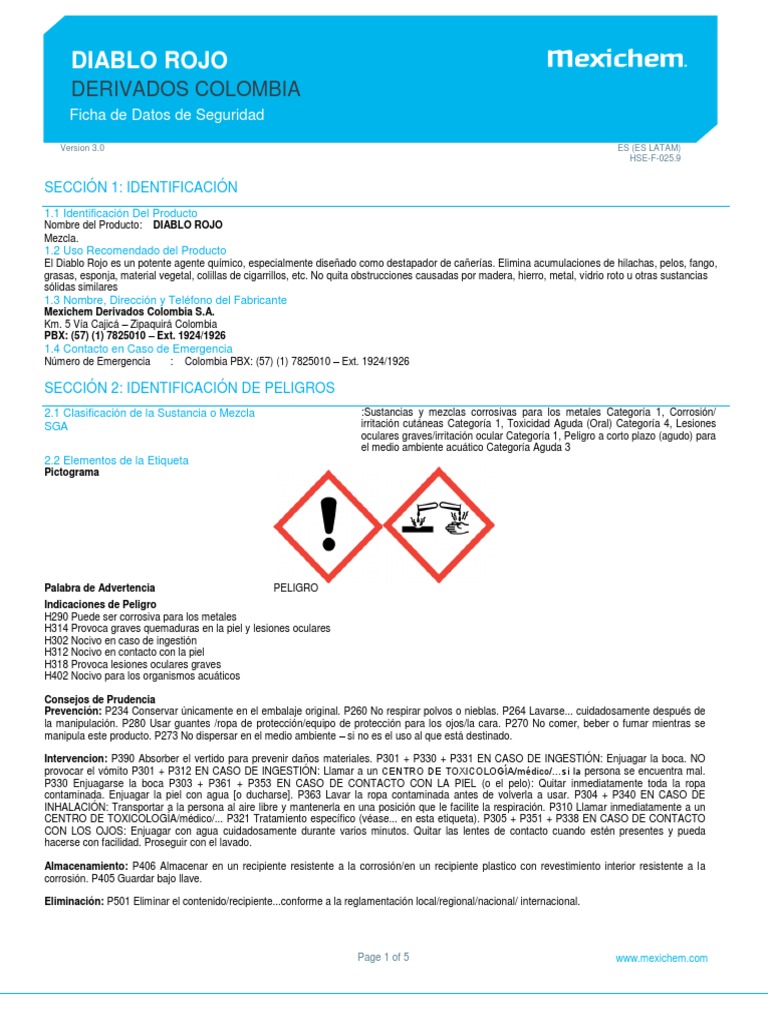 El Diablo Rojo es un potente agente químico, especialmente diseñado como destapador de cañerías. Elimina acumulaciones de hilachas, pelos, fango,