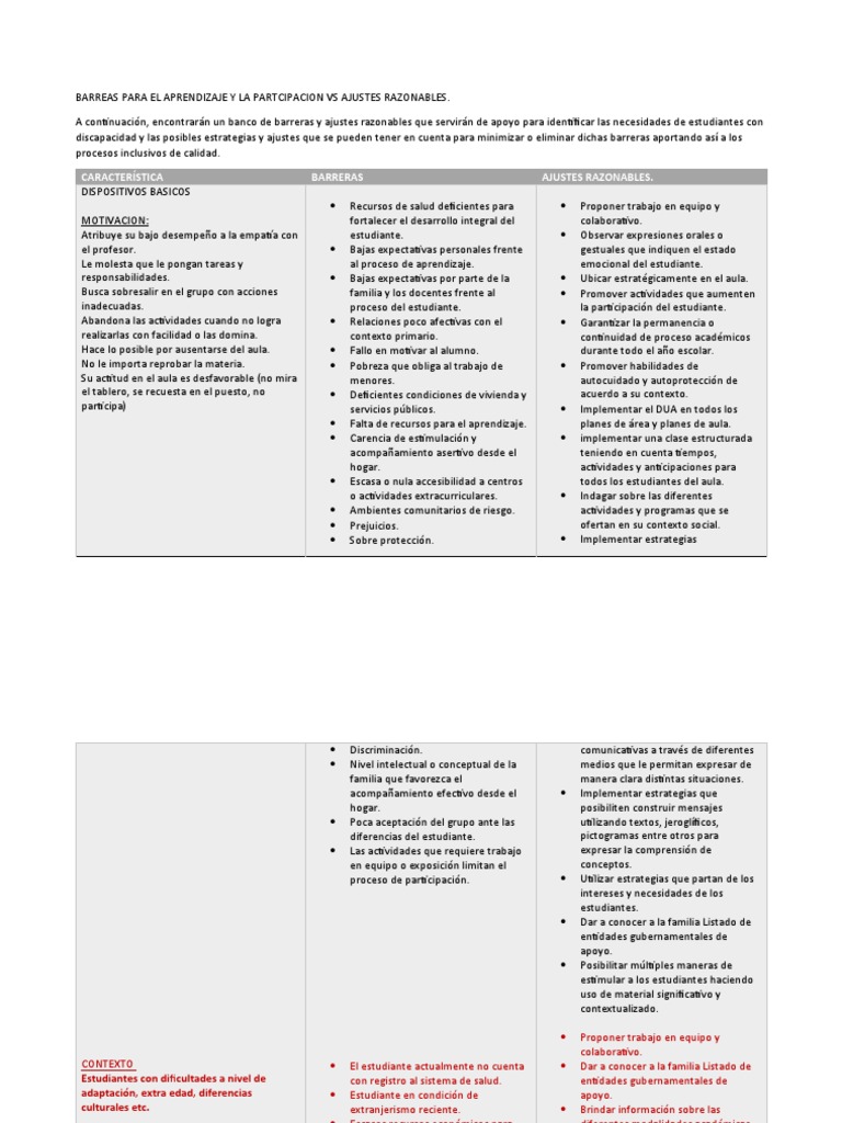 A continuación, encontrarán un banco de barreras y ajustes razonables que servirán de apoyo para identificar las necesidades de estudiantes con
