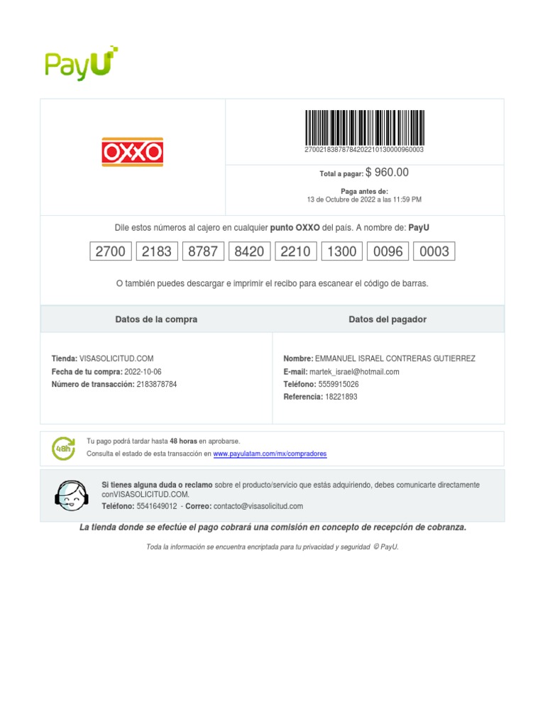 Dile estos números al cajero en cualquier punto OXXO del país. A nombre de: PayU