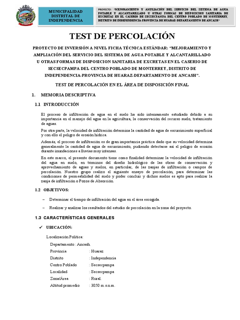 Se anexa los test de percolación realizadas en cada sector, los resultados se indican en las tablas