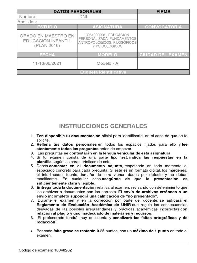 • Extensión máxima destinada para las respuestas: 1 cara.