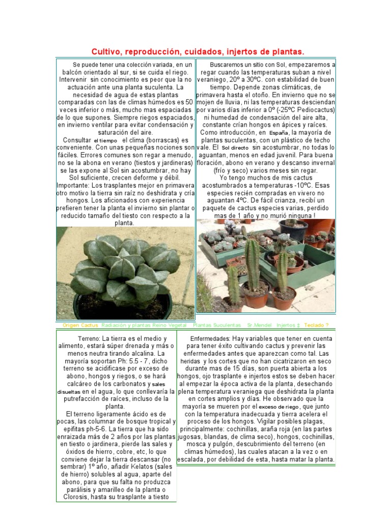 Terreno: La tierra es el medio y Enfermedades: Hay variables que tener en cuenta alimento, estar sper drenada y ms o para tener xito cultivando cactus y prevenir las menos neutra tirando alcalina. La enfermedades antes que aparezcan como tal. Las mayora soportan Ph: 5.5 - 7, dicho heridas y los cortes que no han cicatrizaron en seco terreno se acidificase por exceso de durante mas de 15 das, son puerta abierta a los abono, hongos y riegos, o se har hongos, ojo trasplante e injertos estos se deben hacer calcreo de los carbonatos y sales al empezar la poca activa de la planta, desechando disueltas en el agua, lo que conllevara la plena temperatura veraniega que deshidrata la planta putrefaccin de races, incluso de la en cortes amplios y das. He observado que la planta. mayora se mueren por el exceso de riego, que junto El terreno ligeramente cido es de con la temperatura inadecuada y tierra acelera el pocas, las columnar de bosque tropical y proceso de los hongos. Vigilar posibles plagas, epifitas ph-5-6. La tierra que ha sido principalmente: cochinillas, araa roja (en las partes enraizada ms de 2 aos por las plantas jugosas, blandas, de clima seco), hongos, cochinillas, en tiesto o jardinera, pierde las sales y mosca y pulgn, descubrimiento del terreno (en xidos de hierro, cobre, etc, lo que climas hmedos), las cuales atacan a la vez o en conviene dejar la tierra descansar (no escalada, por debilidad de esta, hasta matar la planta. sembrar) 1 ao, aadir Kelatos (sales de hierro) solubles al agua, aparte del abono, para que su falta no produzca parlisis y amarilleo de la planta o Clorosis, hasta su trasplante a tiesto