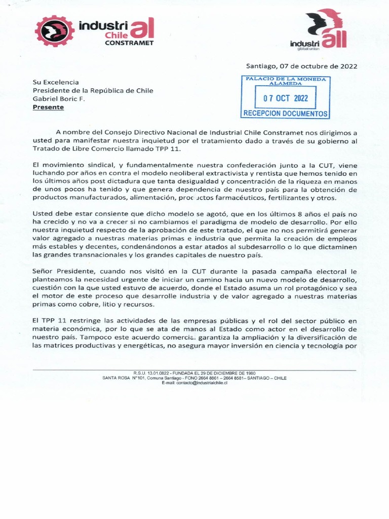 Anombre del Consejo Directive Nacional de Industrial Chile Constramet nos