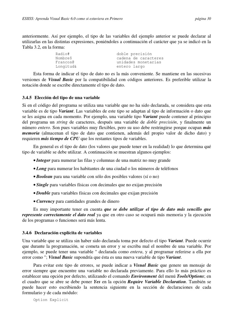 Esta forma de indicar el tipo de dato no es la ms conveniente. Se mantiene en las sucesivas versiones de Visual Basic por la compatibilidad con cdigos anteriores. Es preferible utilizar la notacin donde se escribe directamente el tipo de dato. 3.4.5 Eleccin del tipo de una variable Si en el cdigo del programa se utiliza una variable que no ha sido declarada, se considera que esta variable es de tipo Variant. Las variables de este tipo se adaptan al tipo de informacin o dato que se les asigna en cada momento. Por ejemplo, una variable tipo Variant puede contener al principio del programa un string de caracteres, despus una variable de doble precisin, y finalmente un nmero entero. Son pues variables muy flexibles, pero su uso debe restringirse porque ocupan ms memoria (almacenan el tipo de dato que contienen, adems del propio valor de dicho dato) y requieren ms tiempo de CPU que los restantes tipos de variables. En general es el tipo de dato (los valores que puede tener en la realidad) lo que determina qu tipo de variable se debe utilizar. A continuacin se muestran algunos ejemplos: Integer para numerar las filas y columnas de una matriz no muy grande Long para numerar los habitantes de una ciudad o los nmeros de telfonos Boolean para una variable con slo dos posibles valores (s o no) Single para variables fsicas con decimales que no exijan precisin Double para variables fsicas con decimales que exijan precisin Currency para cantidades grandes de dinero Es muy importante tener en cuenta que se debe utilizar el tipo de dato ms sencillo que represente correctamente el dato real ya que en otro caso se ocupar ms memoria y la ejecucin de los programas o funciones ser ms lenta. 3.4.6 Declaracin explcita de variables Una variable que se utiliza sin haber sido declarada toma por defecto el tipo Variant. Puede ocurrir que durante la programacin, se cometa un error y se escriba mal el nombre de una variable. Por ejemplo, se puede tener una variable " declarada como entera, y al programar referirse a ella por error como "; Visual Basic supondra que sta es una nueva variable de tipo Variant. Para evitar este tipo de errores, se puede indicar a Visual Basic que genere un mensaje de error siempre que encuentre una variable no declarada previamente. Para ello lo ms prctico es establecer una opcin por defecto, utilizando el comando Environment del men Tools/Options; en el cuadro que se abre se debe poner Yes en la opcin Require Variable Declaration. Tambin se puede hacer esto escribiendo la sentencia siguiente en la seccin de declaraciones de cada formulario y de cada mdulo: