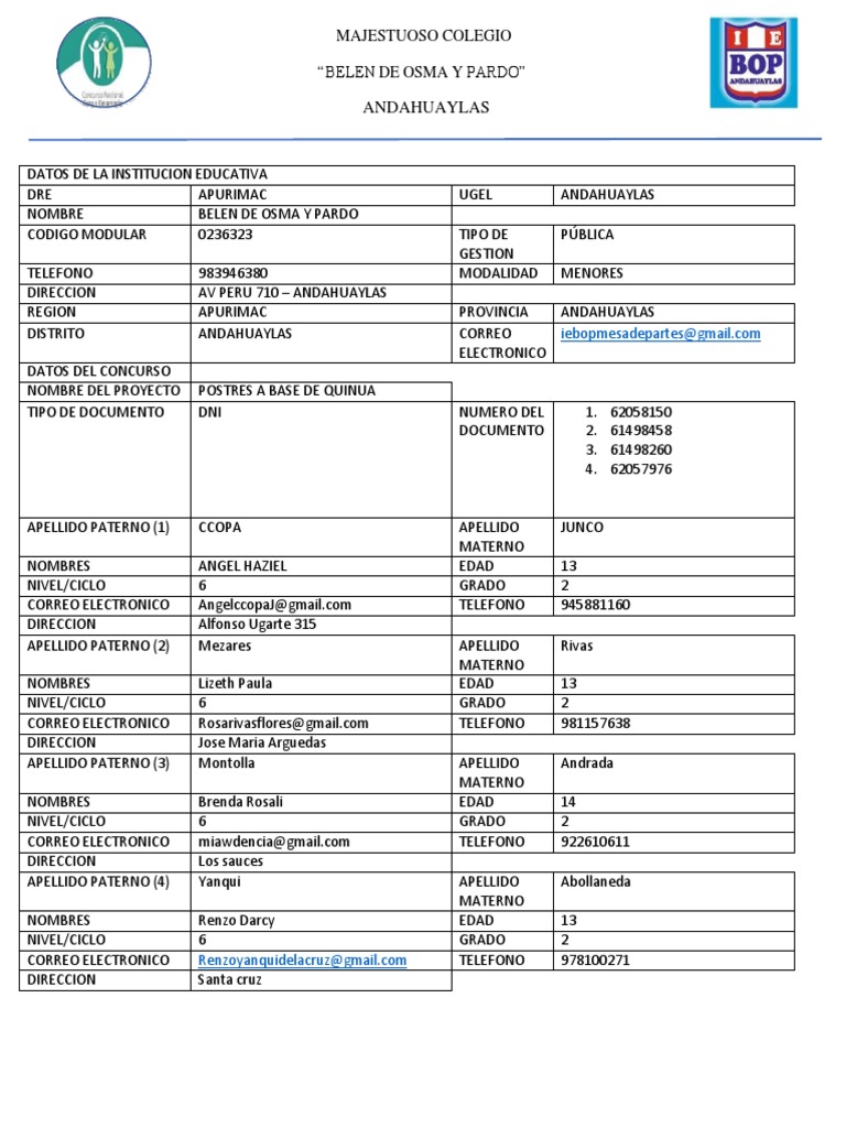 DISTRITO ANDAHUAYLAS CORREO iebopmesadepartes@gmail.com