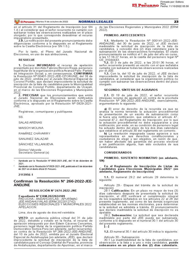 corresponda, únicamente a través de sus respectivas CONFIRMAR la Resolución Nº 266-2022-JEE-AND/JNE,