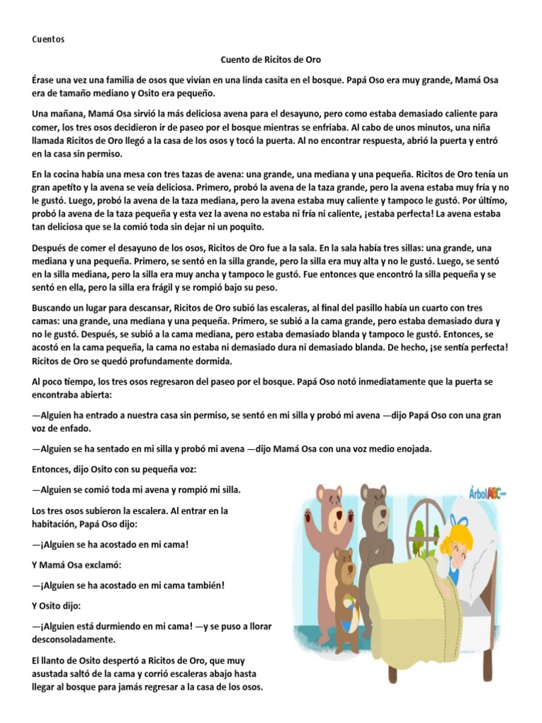 llamada Ricitos de Oro llegó a la casa de los osos y tocó la puerta. Al no encontrar respuesta, abrió la puerta y entró