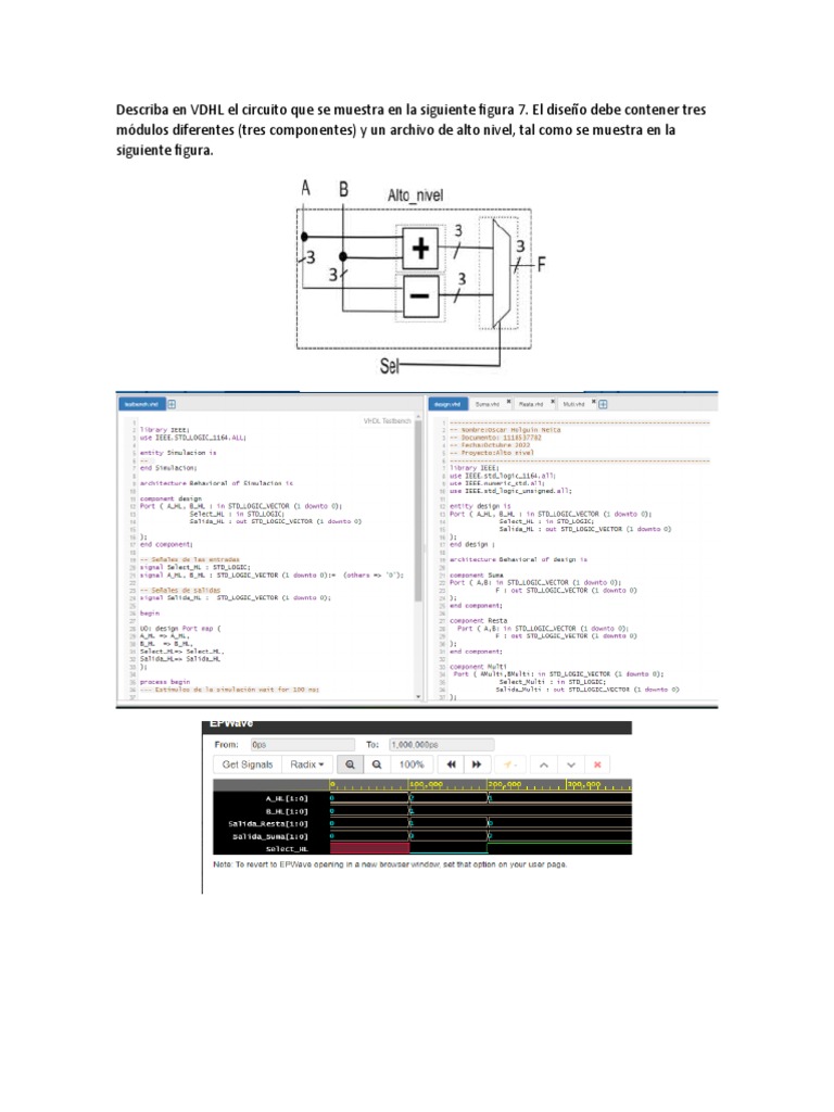 El documento describe un circuito que se muestra en una figura 7 y requiere diseñarlo en VHDL con tres módulos diferentes y un archivo de alto nivel.