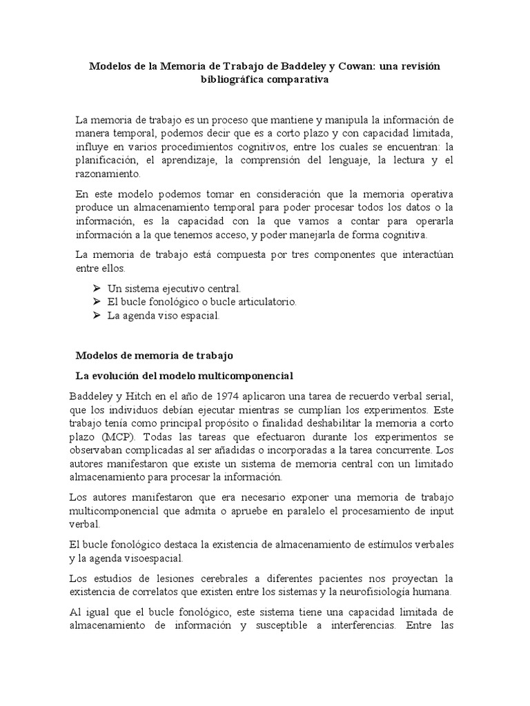 Modelos de la Memoria de Trabajo de Baddeley y Cowan: una revisión