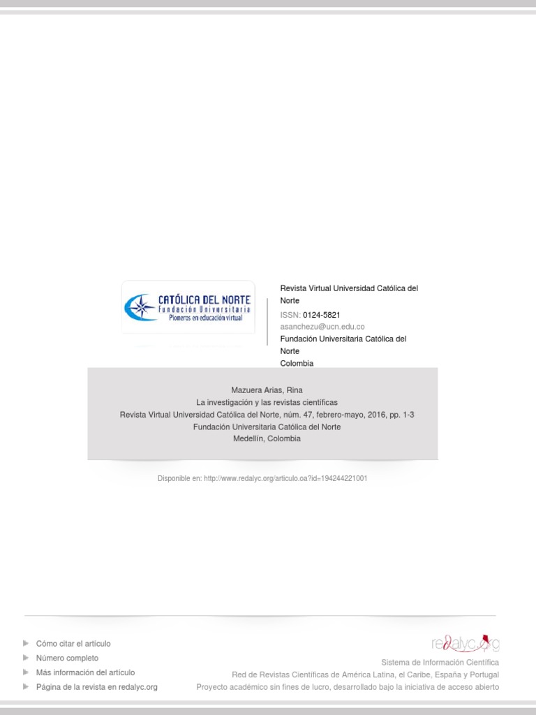 Mazuera Arias, R. (2016). La investigación y las revistas científicas. Revista Virtual Universidad Católica
