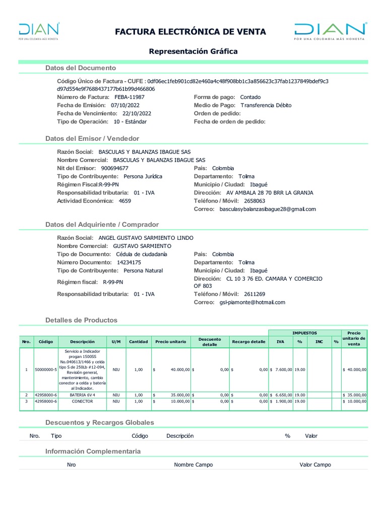 Número de Factura: FEBA-11987 Forma de pago: Contado