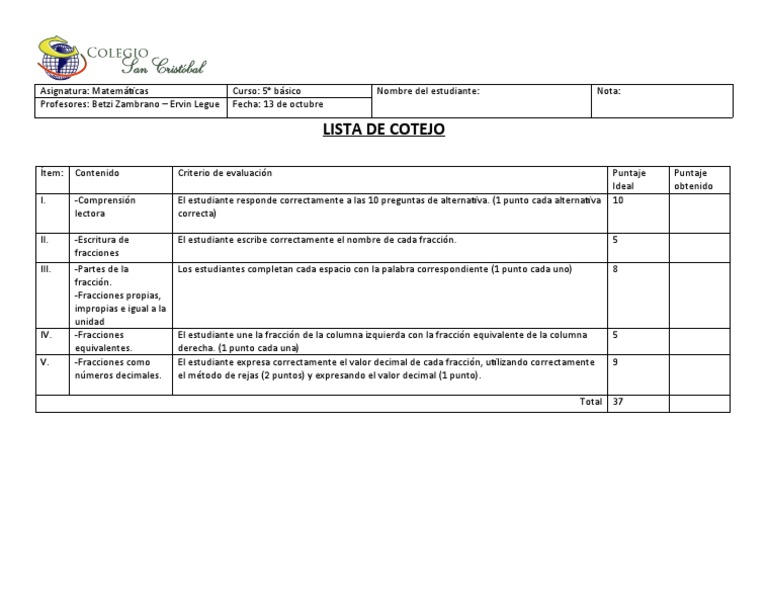 Asignatura: Matemáticas Curso: 5° básico Nombre del estudiante: Nota: