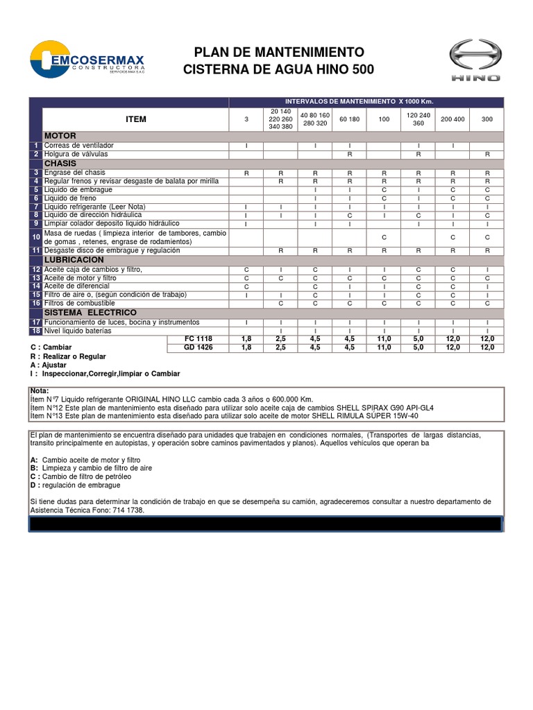 El plan de mantenimiento se encuentra diseñado para unidades que trabajen en condiciones normales, (Transportes de largas distancias,