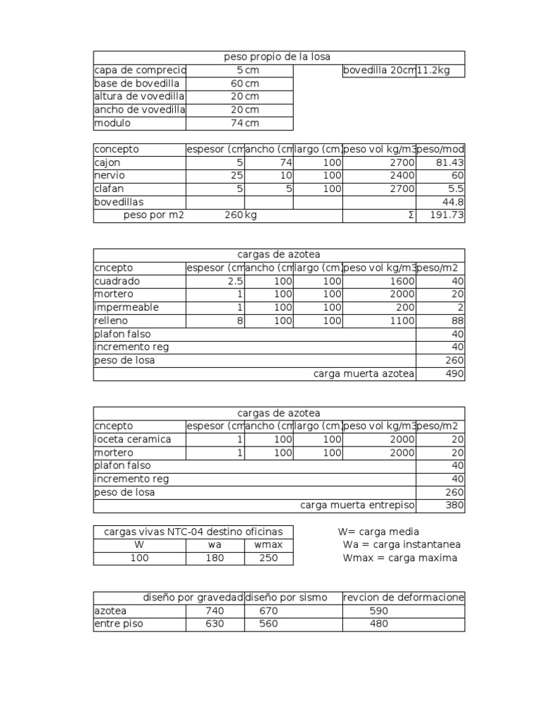 cargas de azotea espesor (cm) ancho (cm) largo (cm)peso vol kg/m3peso/m2 1 100 100 2000 20 1 100 100 2000 20 40 40 260 carga muerta entrepiso 380 W= carga media Wa = carga instantanea Wmax = carga maxima