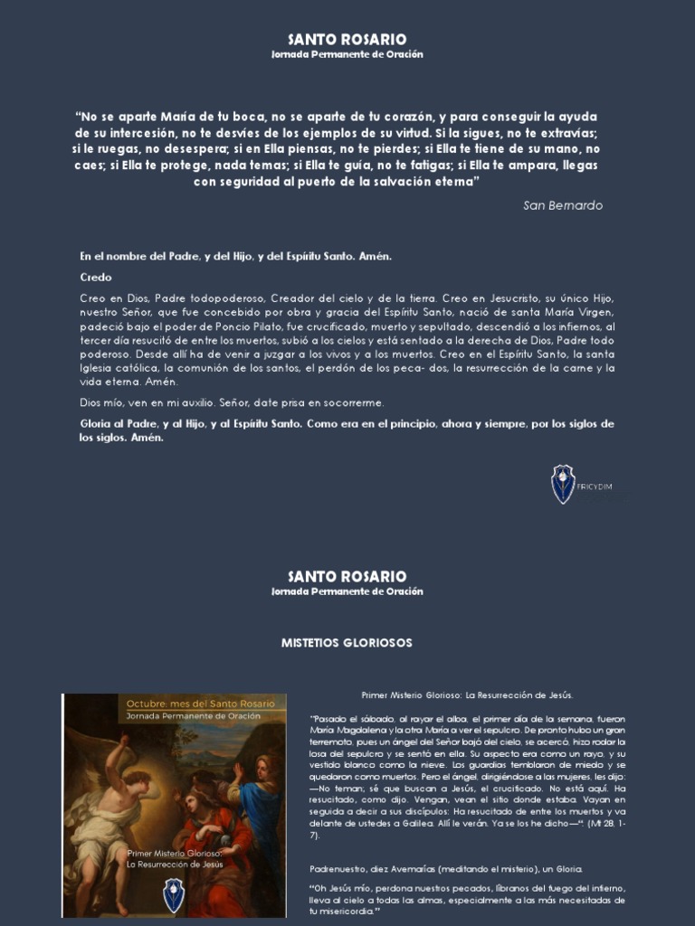 Padrenuestro, diez Avemarías (meditando el misterio), un Gloria.