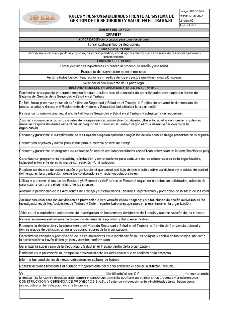 ROLES Y RESPONSABILIDADES FRENTE AL SISTEMA DE GESTIÓN DE LA SEGURIDAD Y SALUD Fecha: 22-06-2022