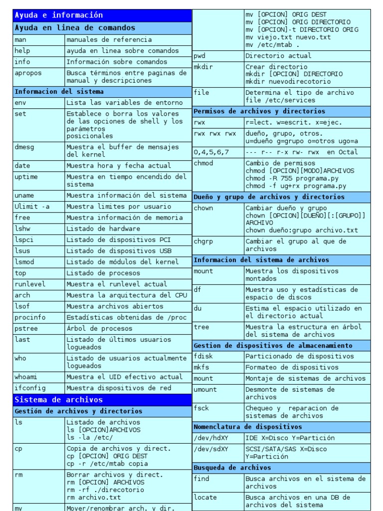 man help info apropos manuales de referencia ayuda en linea sobre comandos Informacin sobre comandos Busca trminos entre paginas de manual y descripciones Lista las variables de entorno Establece o borra los valores de las opciones de shell y los parmetros posicionales Muestra el buffer de mensajes del kernel Muestra hora y fecha actual Muestra en tiempo encendido del sistema Muestra informacin del sistema Muestra limites por usuario Muestra informacin de memoria Listado de hardware Listado de dispositivos PCI Listado de dispositivos USB Listado de mdulos del kernel Listado de procesos Muestra el runlevel actual Muestra la arquitectura del CPU Muestra archivos abiertos Estadsticas obtenidas de /proc rbol de procesos Listado de ltimos usuarios logueados Listado de usuarios actualmente logueados Muestra el UID efectivo actual Muestra dispositivos de red tree mount df du chgrp chown rwx rwx rwx rwx 0,4,5,6,7 chmod pwd mkdir