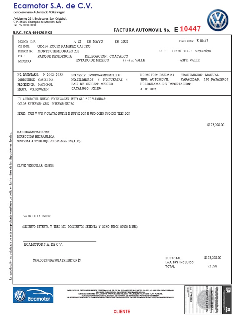FACTURA AUTOMOVIL No. E 10447