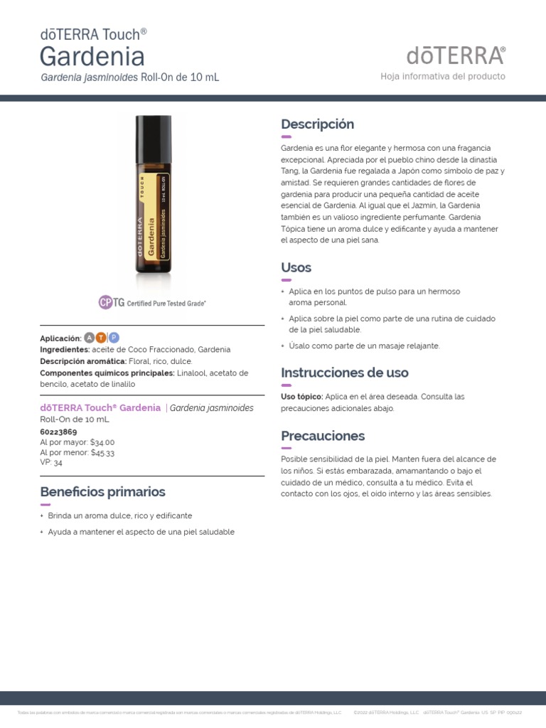 Todas las palabras con símbolos de marca comercial o marca comercial registrada son marcas comerciales o marcas comerciales registradas de dōTERRA Holdings, LLC ©2022 dōTERRA Holdings, LLC dōTERRA Touch® Gardenia US SP PIP 090122