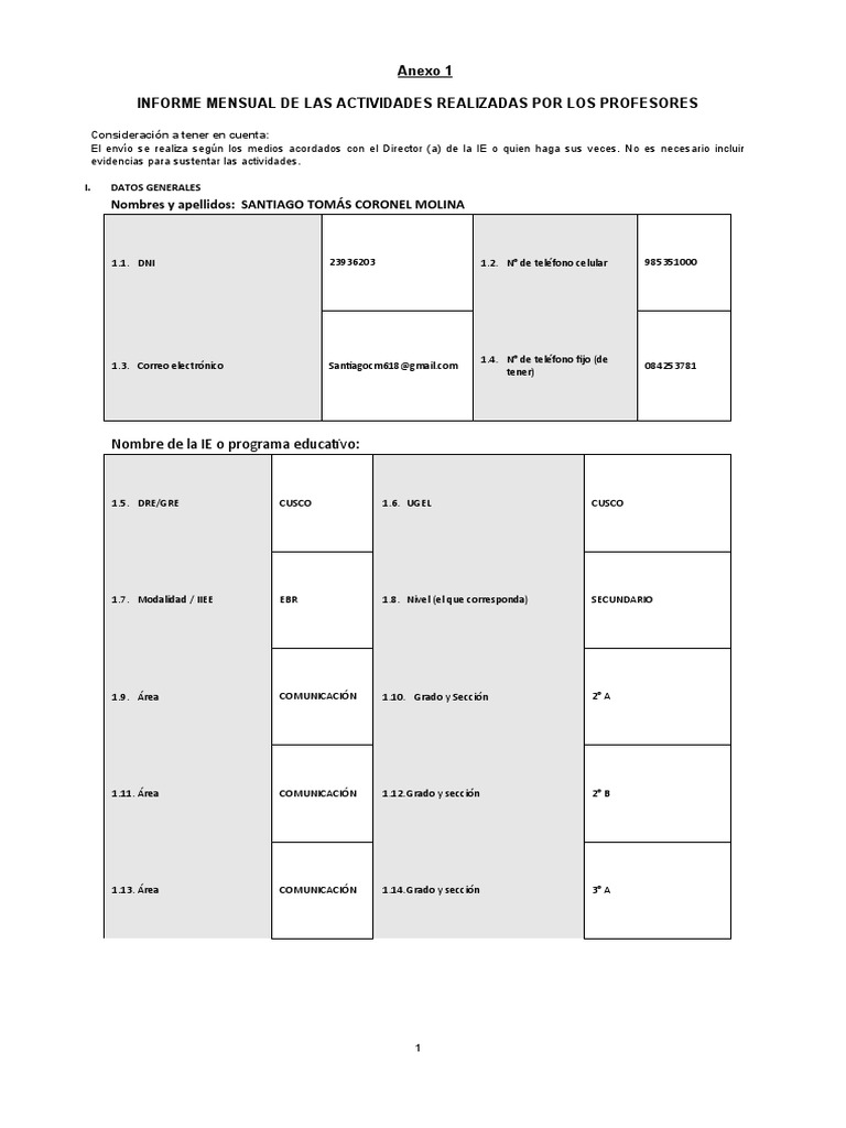 1.1. DNI 23936203 1.2. N° de teléfono celular 985351000