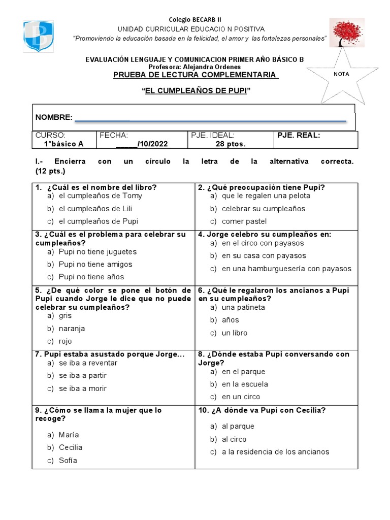 EVALUACIÓN LENGUAJE Y COMUNICACION PRIMER AÑO BÁSICO B