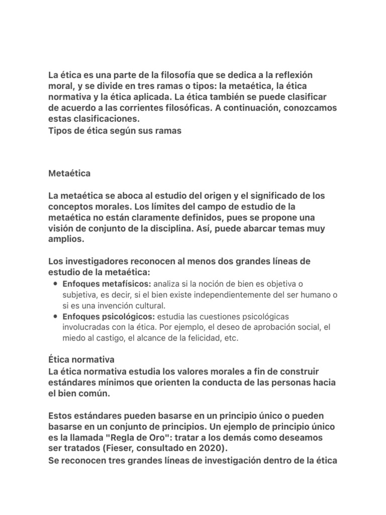 moral, y se divide en tres ramas o tipos: la metaética, la ética