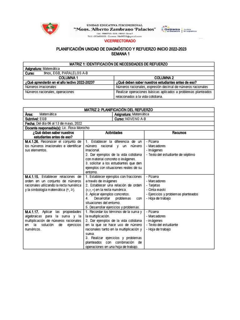 PLANIFICACIÓN UNIDAD DE DIAGNÓSTICO Y REFUERZO INICIO 2022-2023