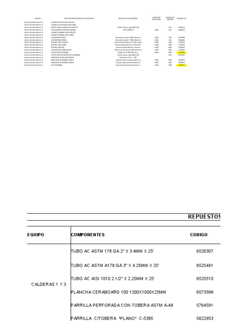 EQUIPO DESCRIPCIÓN REPUESTO Y/O MATERIAL REPUESTO Y/O MATERIAL CÓDIGO SAP
