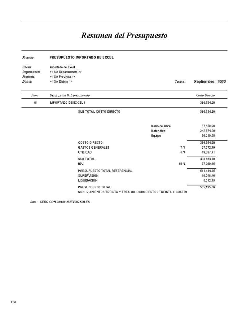 Distrito << Sin Distrito >> Costo a : Septiembre - 2022