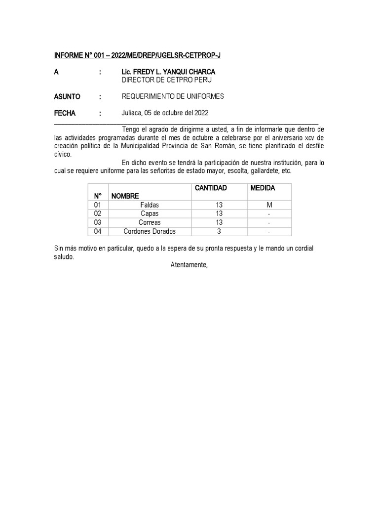 INFORME N° 001 – 2022/ME/DREP/UGELSR-CETPROP-J