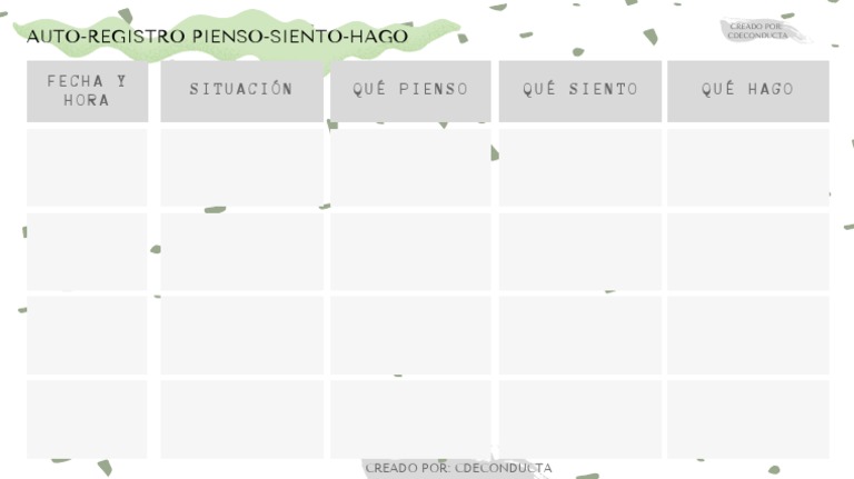 Este documento es un formato para auto-registro de situaciones, pensamientos, sentimientos y acciones. El formato incluye columnas para describir la fecha y hora de un incidente, la situación, los pensamientos sobre la situación, los sentimientos asociados y las acciones tomadas.