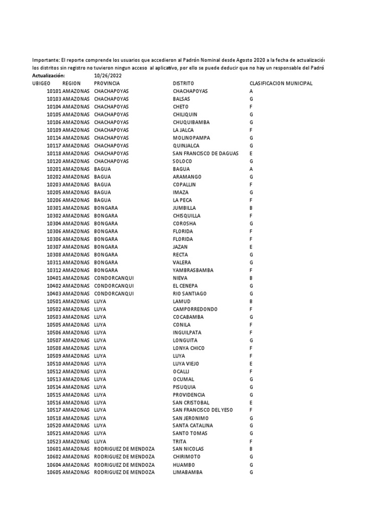 UBIGEO REGION PROVINCIA DISTRITO CLASIFICACION MUNICIPAL