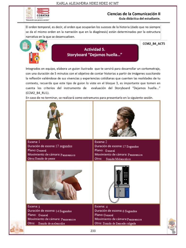 El documento presenta una lista de 4 entradas que describen brevemente sonidos de diferentes duraciones y características como pasos, melancolía y una llamada colgada. Cada entrada incluye la duración del sonido, una descripción general y el tipo de sonido.