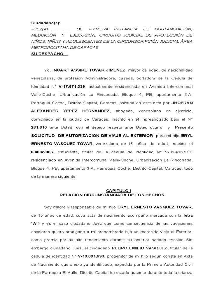 SOLICITUD DE AUTORIZACION DE VIAJE AL EXTERIOR, para mi hijo ERYL