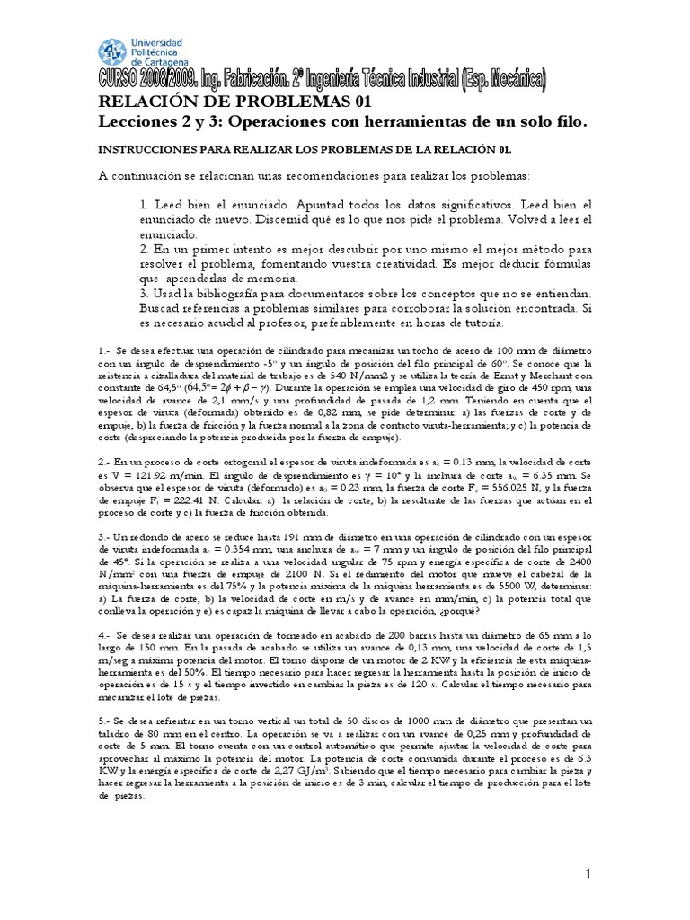 1.- Se desea efectuar una operación de cilindrado para mecanizar un tocho de acero de 100 mm de diámetro