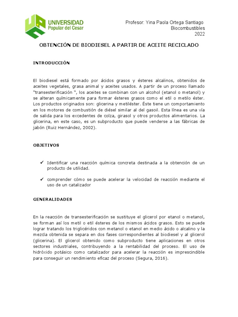 4: Caracterizar el aceite residual y el producto obtenido (Biodiesel). Según la