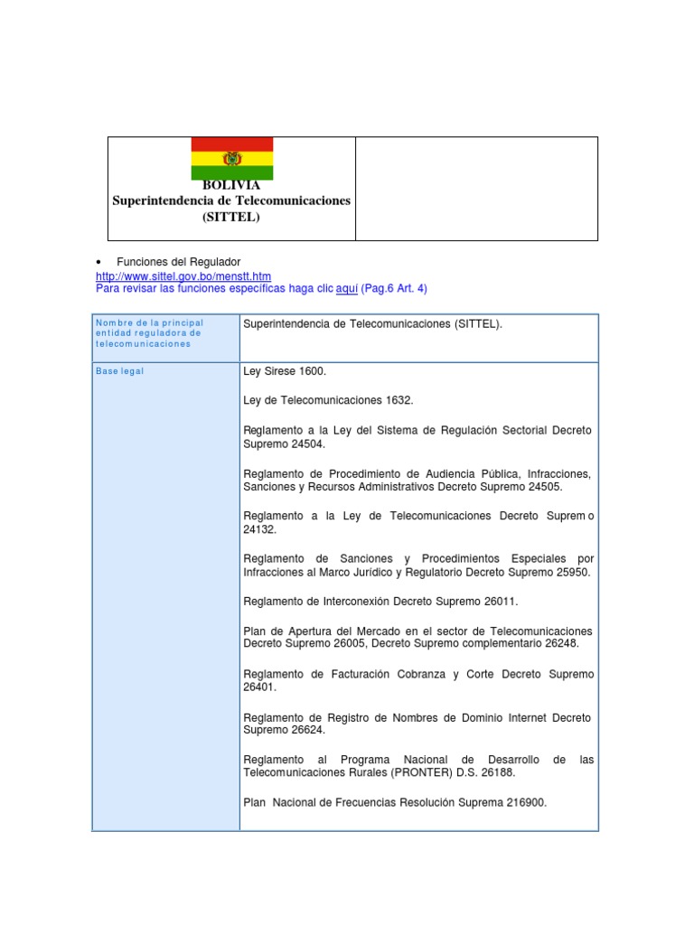 Ley Sirese 1600. Ley de Telecomunicaciones 1632. Reglamento a la Ley del Sistema de Regulación Sectorial Decreto Supremo 24504. Reglamento de Procedimiento de Audiencia Pública, Infracciones, Sanciones y Recursos Administrativos Decreto Supremo 24505. Reglamento a la Ley de Telecomunicaciones Decreto Suprem o 24132. Reglamento de Sanciones y Procedimientos Especiales por Infracciones al Marco Jurídico y Regulatorio Decreto Supremo 25950. Reglamento de Interconexión Decreto Supremo 26011. Plan de Apertura del Mercado en el sector de Telecomunicaciones Decreto Supremo 26005, Decreto Supremo complementario 26248. Reglamento de Facturación Cobranza y Corte Decreto Supremo 26401. Reglamento de Registro de Nombres de Dominio Internet Decreto Supremo 26624. Reglamento al Programa Nacional de Desarrollo Telecomunicaciones Rurales (PRONTER) D.S. 26188. Plan Nacional de Frecuencias Resolución Suprema 216900. de las