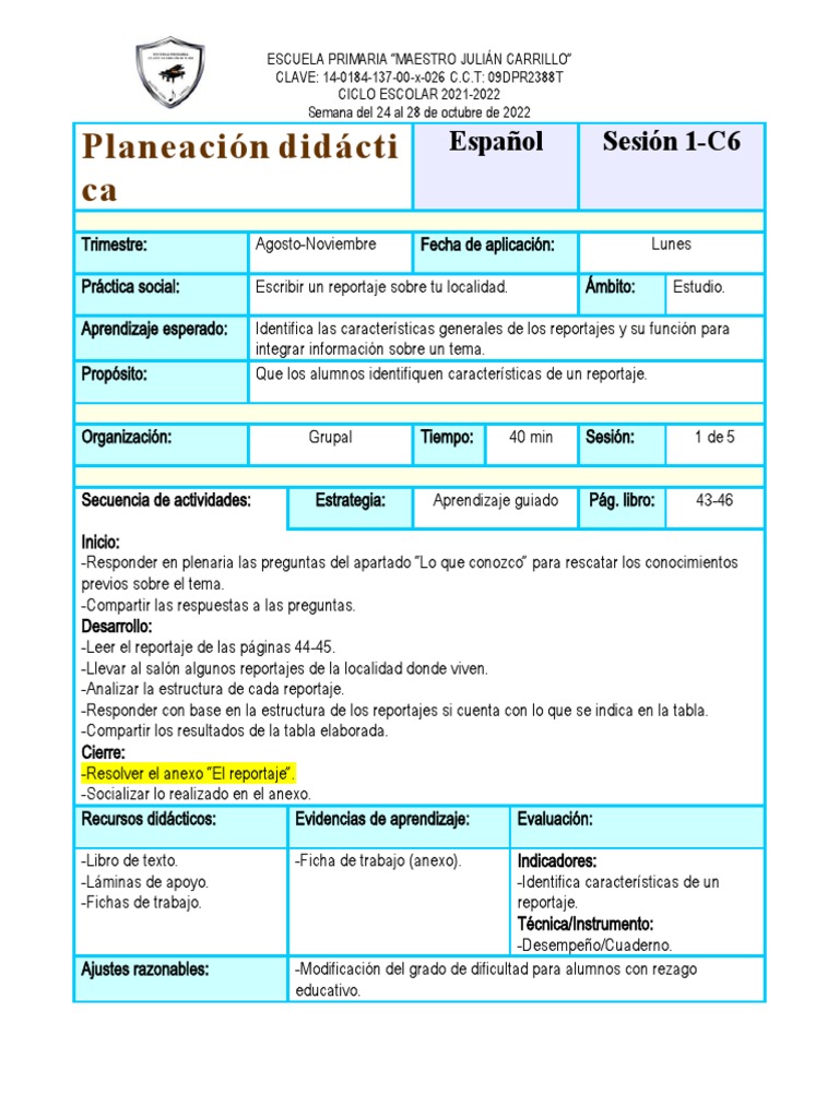 Propósito: Que los alumnos identifiquen características de un reportaje.