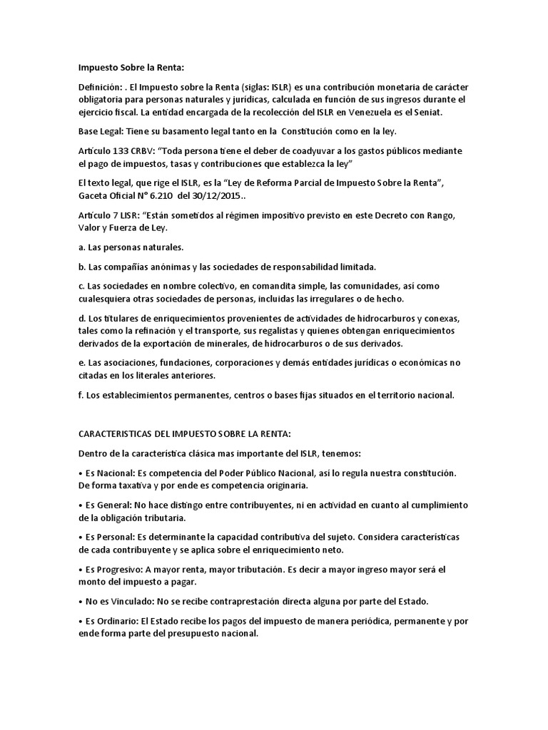 ejercicio fiscal. La entidad encargada de la recolección del ISLR en Venezuela es el Seniat.