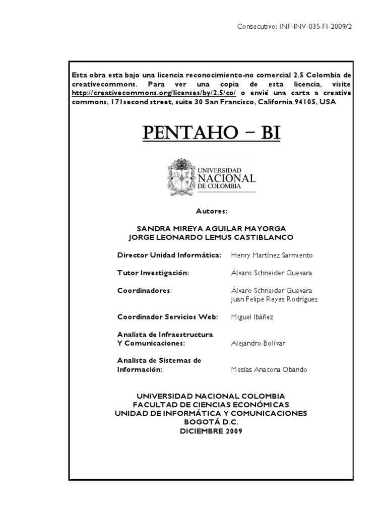 Pentaho-BI es un software libre que cumple el objetivo de anlisis de datos y sirve como base para toma de decisiones empresariales, una de sus grandes ventajas, se debe a su versatibilidad y compatibilidad en la generacin de informes en HTML, Excel entre otros, de igual forma esta tambin puede obtener informacin de otros sistemas de informacin. Partiendo de lo anteriormente mencionado, en el mundo actual es de vital importancia que los sistemas de informacin sean integrales, para reducir costos de transaccin y de tiempo, que son importantes para la generacin de actividades internas y poder crear estrategias externas y al interior de la organizacin. Los componentes que conforman la plataforma de Pentaho BI son: Reporting, Analysis, Dashboard, Data mining e Integracin de datos. Al ver las reas que componen el Software, podemos decir que es necesario una base clara con permisos definidos que permitan la buena utilizacin de la herramienta a favor de la empresa. La plataforma Open Source Pentaho Business Intelligence cubre muy amplias necesidades de Anlisis de los Datos y de los Informes empresariales. Las soluciones de Pentaho estn escritas en Java y tienen un ambiente de implementacin tambin basado en Java. Eso hace que Pentaho es una solucin muy flexible para cubrir una amplia gama de necesidades empresariales tanto las tpicas como las sofisticadas y especificas al negocio. Los mdulos de la plataforma Pentaho BI son: Reporting - un modulo de los informes ofrece la solucin adecuada a las necesidades de los usuarios. Pentaho Reporting es una solucin basada en el proyecto JFreeReport y permite generar informes gil y de gran capacidad. Pentaho Reporting permite la distribucin de los resultados del anlisis en mltiples formatos - todos los informes incluyen la opcin de imprimir o exportar a formato PDF, XLS, HTML y texto. Los reportes Pentaho permiten tambin programacin de tareas y ejecucin automtica de informes con una determinada periodicidad. Anlisis - Pentaho Anlisis suministra a los usuarios un sistema avanzado de anlisis de informacin. Con uso de las tablas dinmicas (pivot tables, crosstabs), generadas por Mondrian y JPivot, el usuario puede navegar por los datos, ajustando la visin de los datos, los filtros de visualizacin, aadiendo o quitando los campos de agregacin. Los datos pueden ser representados en una forma de SVG o Flash, los dashboards widgets, o tambin integrados con los sistemas de minera de datos UNIVERSIDAD NACIONAL COLOMBIA FACULTAD DE CIENCIAS ECONMICAS UNIDAD DE INFORMTICA Y COMUNICACIONES 5