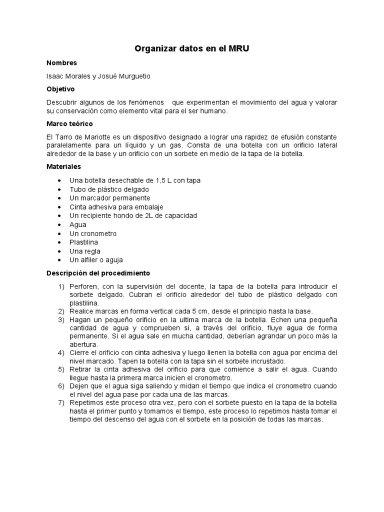 el nivel del agua pase por cada una de las marcas.