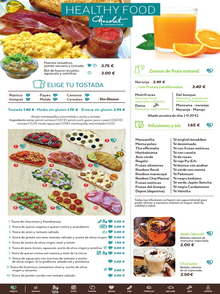 tomate (+0.25); medio aguacate (+1.10€); mantequilla, mermelada (+0.25).