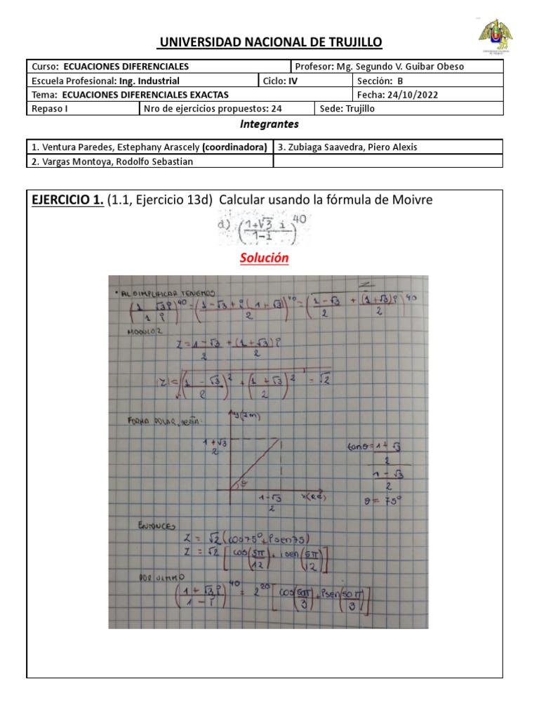 EJERCICIO 1. (1.1, Ejercicio 13d) Calcular usando la fórmula de Moivre