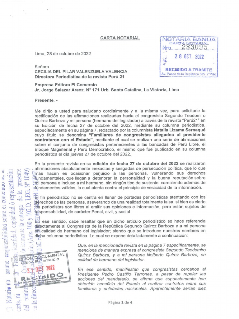 rectificacién de las afirmaciones realizadas hacia el congresista Segundo Teodomiro