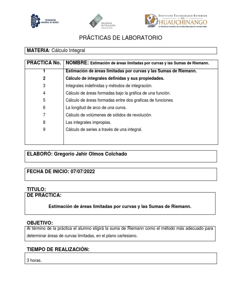 PRÁCTICA No. NOMBRE: Estimación de áreas limitadas por curvas y las Sumas de Riemann.