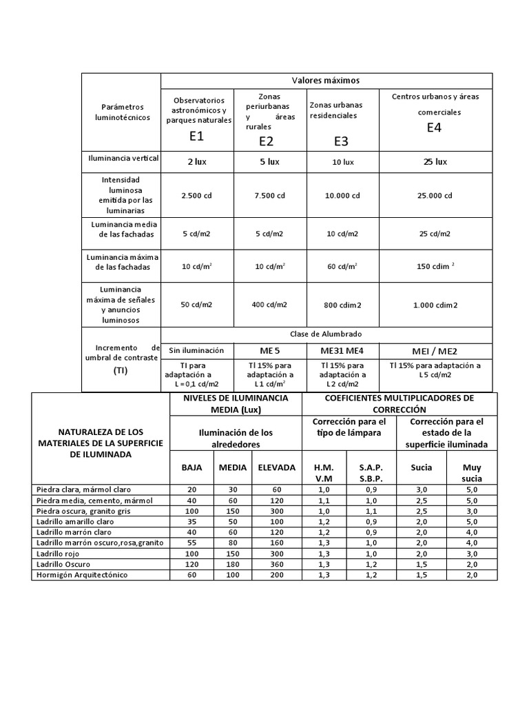 1. Valores mínimos de iluminancia media en servicio con mantenimiento de la instalación sobre la superficie limpia