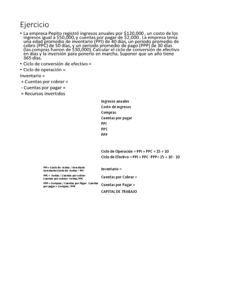 Ciclo de Efectivo = PPI + PPC -PPP= 15 + 10 - 10
